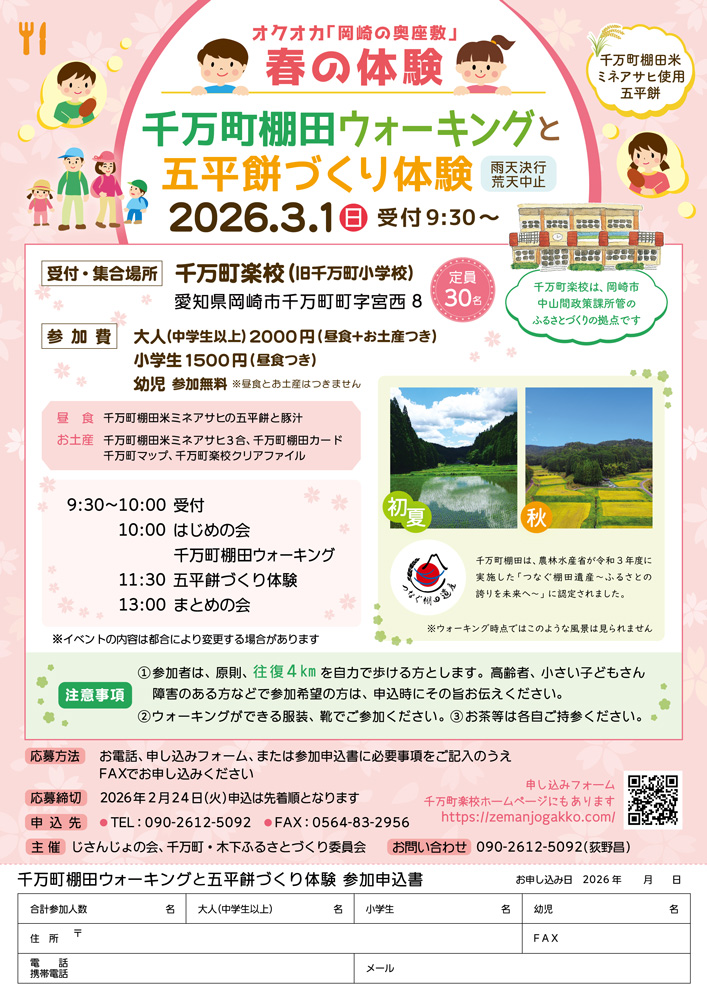| 参加費 | ◇ 大人(中学生以上) 2000円(昼食+お土産つき) ◇ 子ども 1500円 (昼食つき) ◇ 幼児 参加無料 ※昼食・お土産はつきません <昼食> 千万町棚田米ミネアサヒの五平餅と豚汁 <お土産> 千万町棚田米ミネアサヒ3合、千万町棚田カード、千万町マップ、千万町楽校クリアファイル |